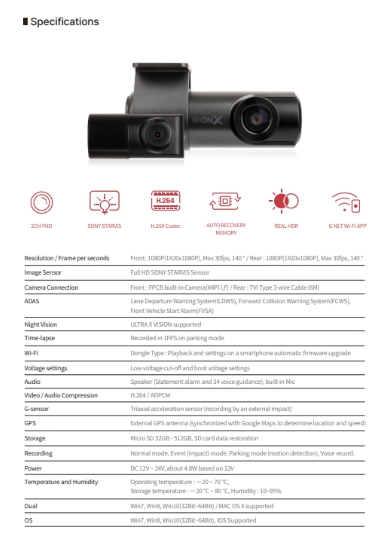 G-ON X Dual-Channel Full HD Dashcamera [Made-in-Korea] | SONY Starvis CMOS Sensor front and rear